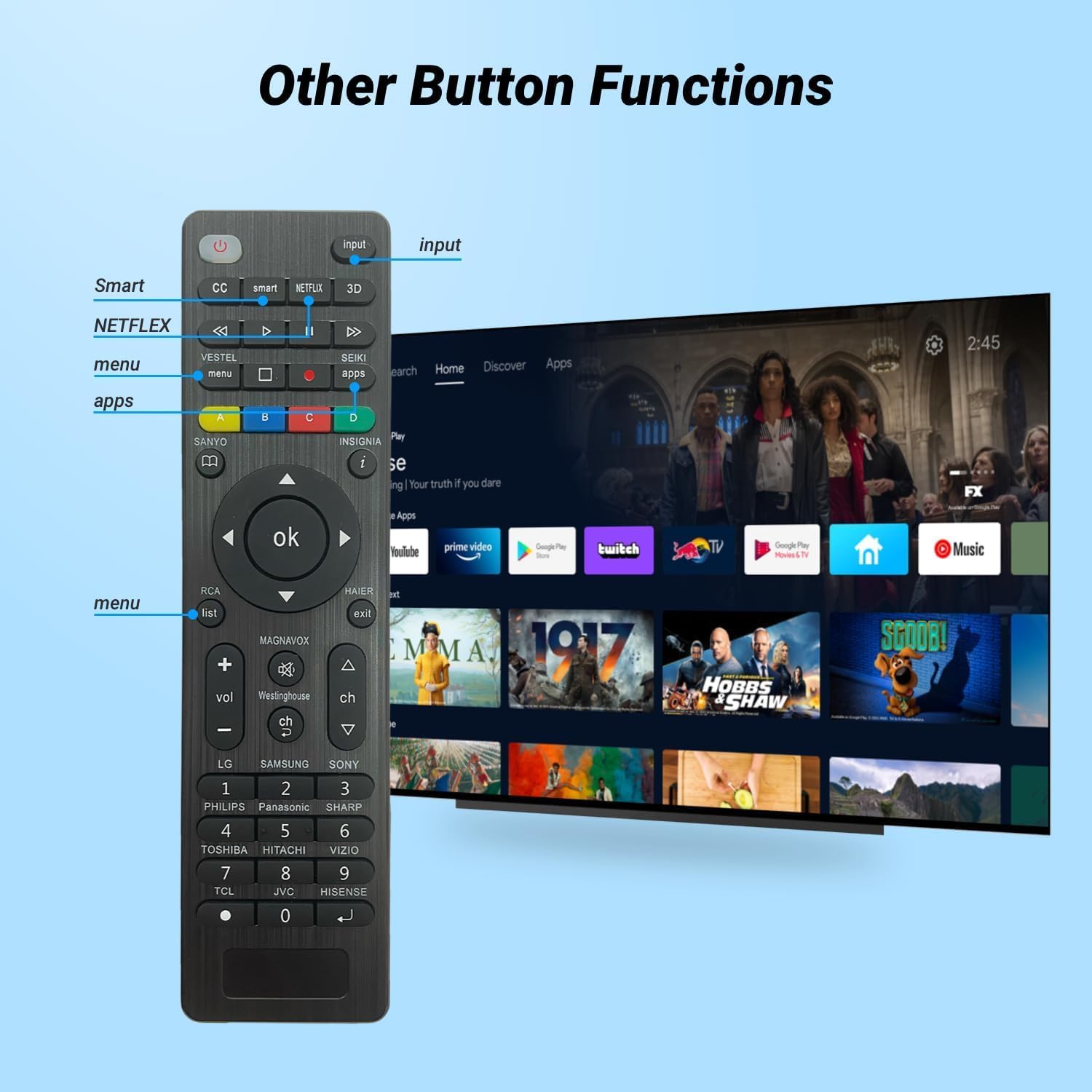 Multi-function remote control:Universal remote control is compatible with of audio and video devices, including TVs, DVD/Blu-ray players, Media Streaming Players, Sound Bar Audios and more! Compatible with TV brands include: Samsung,LG,Vizio,Sony,TCL,Insignia,Toshiba,Smart TVs, etc…