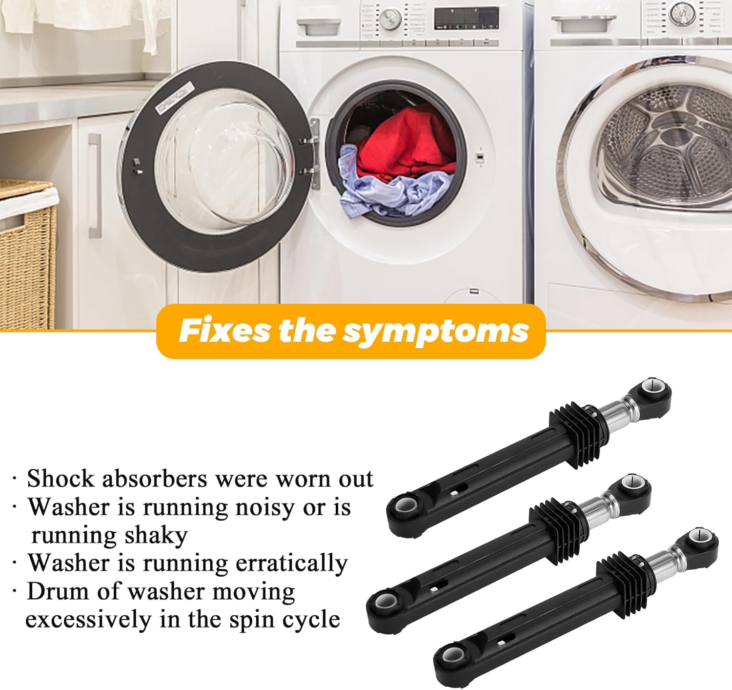 ✔✔【PACKAGE INCLUDES】: ►Including 3 x 383EER3001G washer shock absorbers, 6 x mounting pins. 383EER3001G lg washer shock absorber is retractable, max extension: 11.7”, max compression: 7.5”. ►The 383eer3001j shock absorbers for lg washer is made of high quality Metal, ABS plastic and rubber, strong, not easy to rust, not easy to wear and tear and break, the 383eer3001g washer shock absorbers expansion and contraction is very flexible.►383EER3001G 4901ER2003A 383eer3001J washing machine shock absorber can fix the symptoms: ❶ shock absorbers were worn out or damaged ❷ washer is running noisy or shaky ❸ washer is running erratically