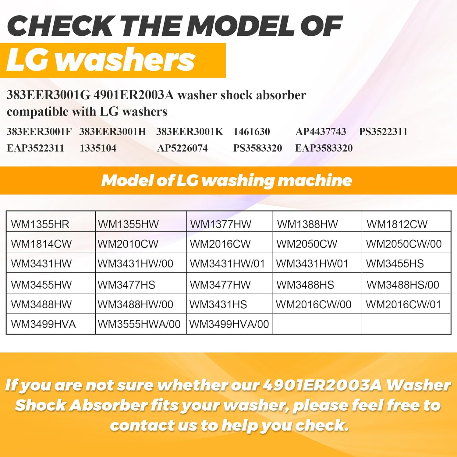 ✔✔【FIT MODEL】: The 383EER3001G 4901ER2003A washing machine shock absorber can replace 4901er2003a, 383eer3001g, 383eer3001j, 383eer3001f, 383eer3001h, 383eer3001k, ah3522311, ea3522311, ps3522311, ap4437743, 1461630, 1335104, ap5226074, ps3583320, eap3583320. ►Replacement for 383eer3001g lg washer shocks: wm3431hs, wm2016cw/00, wm2016cw/01, wm3499hva, wm3555hwa/00, wm3499hva/00, wm1355hr,wm1355hw, wm1377hw, wm1388hw, wm1812cw, wm1814cw, wm2010cw, wm2016cw, wm2050cw, wm3431hw, wm3455hs, wm3455hw, wm3477hs, etc