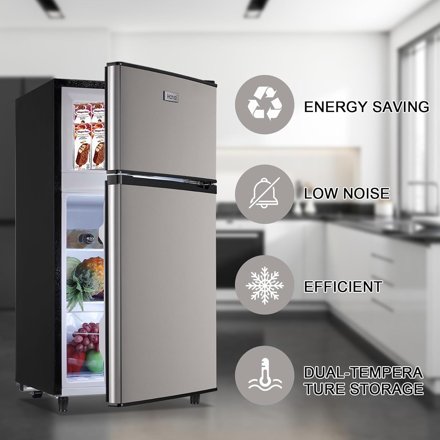 WANAI Mini Fridge with Freezer 3.5 Cu.Ft Freezer Refrigerator with 7 Level Adjustable 2 Door Design with Adjustable Thermostat for Dorm, Office, Kitchen, Silver