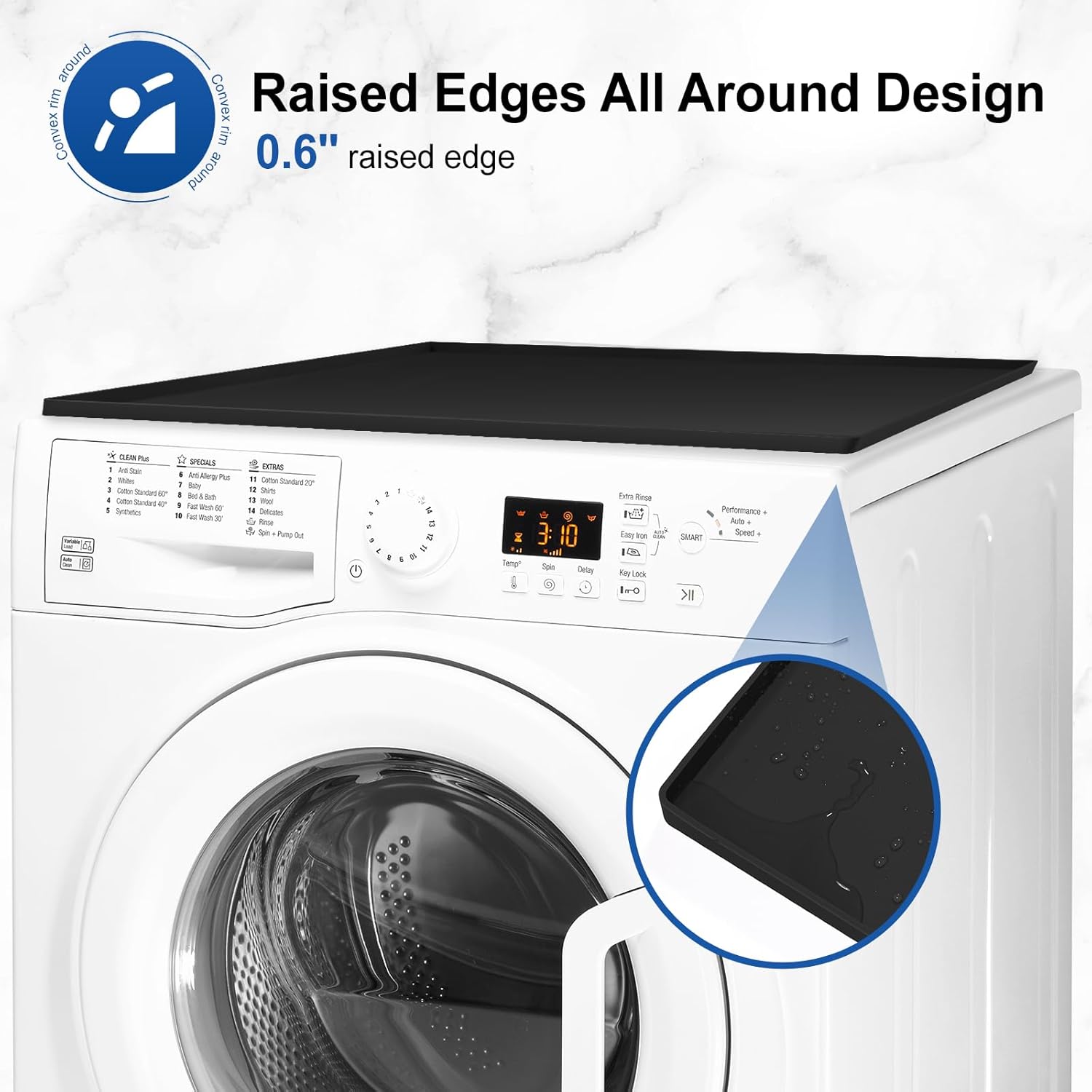 [Raised Edges All Around Design] The lip design provides extra coverage, keeping liquids and debris contained, prevent liquids from dripping and soiling the machine and floor, keeping your laundry room tidy, enhancing the overall protection of your washer and dryer