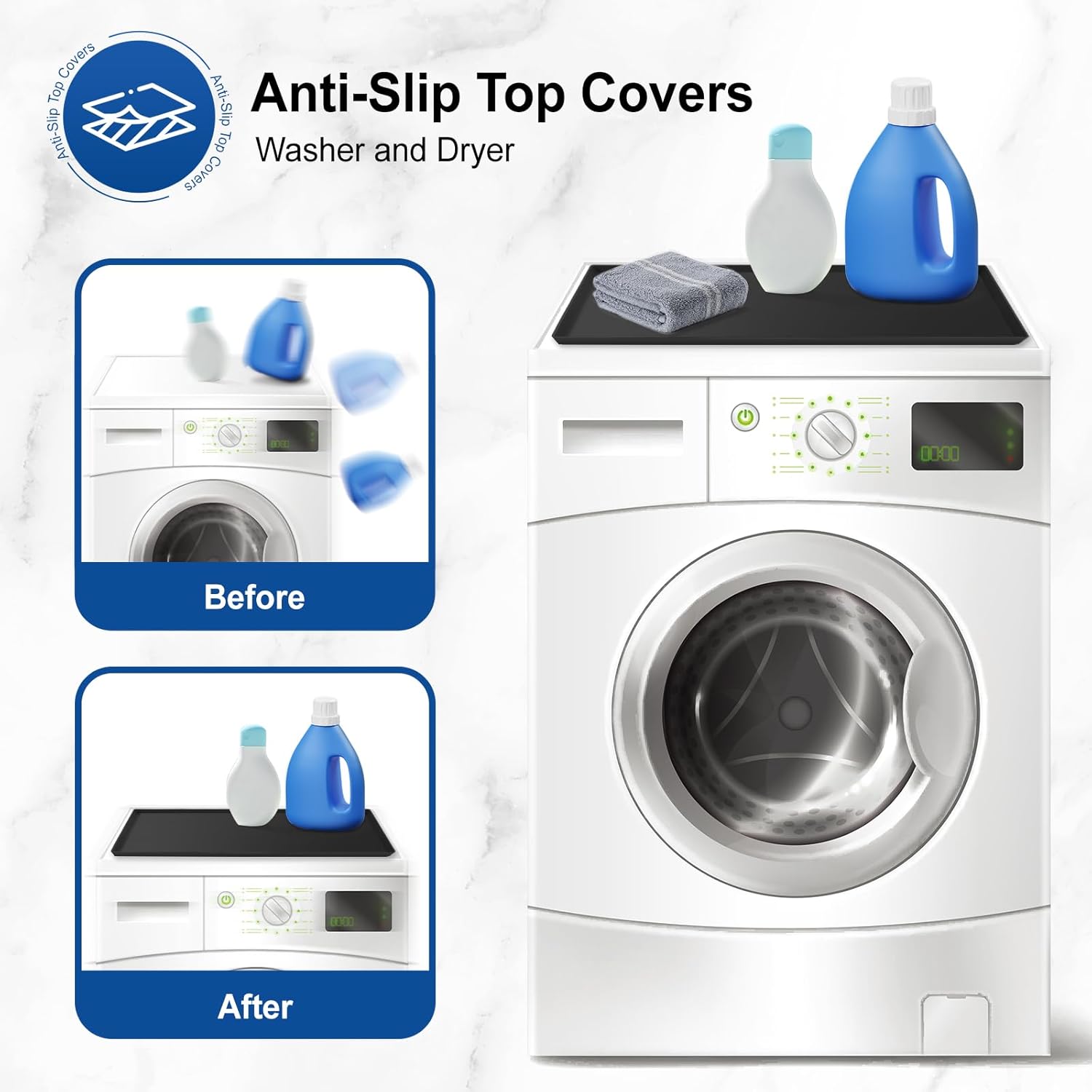 [Anti-Slip Washer and Dryer Top Covers] Keep your fabric softener, laundry detergent standing secure on the top of the washing machine with our premium silicone mats, designed to keep your washer and dryer clean by preventing the drips from the softener and detergent
