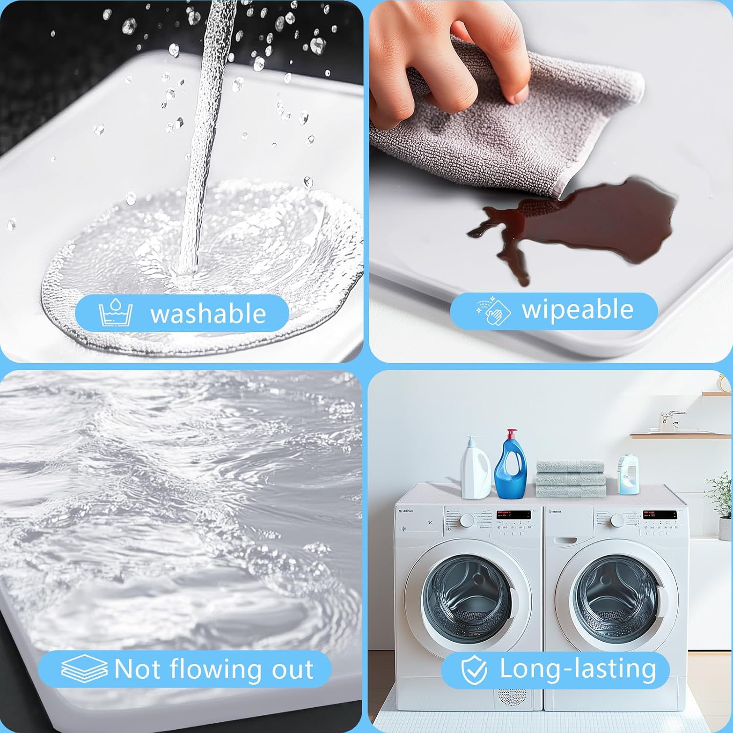 Leak-Proof and Non-Slip:washer mat has a 0.6-inch convex edge that prevents any liquid spills and keep the area neat and tidy, while the surface of the washer mat made a non-slip design,the mat can be firmly attached to the top of the machine,the washing supplies and clothes placed on the washer dryer protector mat no longer need to worry about slipping off