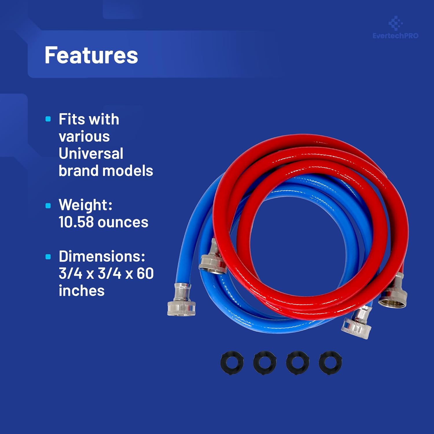 This EvertechPRO pair of stainless steel washing machine hoses are designed to fit all washing machines with a standard 3⁄4” FIP female hose thread connector, providing you with a convenient solution for connecting your washer to the water supply. With a rubber inner tube and braided stainless steel exterior, they are both rustproof and burst proof – even under high pressure water – so you can feel secure that your hose is protected against damage. Installation couldn’t be simpler, with no need for plumbers or engineers. Simply unscrew your original hose and replace it with this one – no special tools are required. We are so confident in our product that we offer a 90-day money back guarantee. Make sure your washer stays connected with these durable 5ft long washing machine hoses featuring 3⁄4” MIP connectors.
