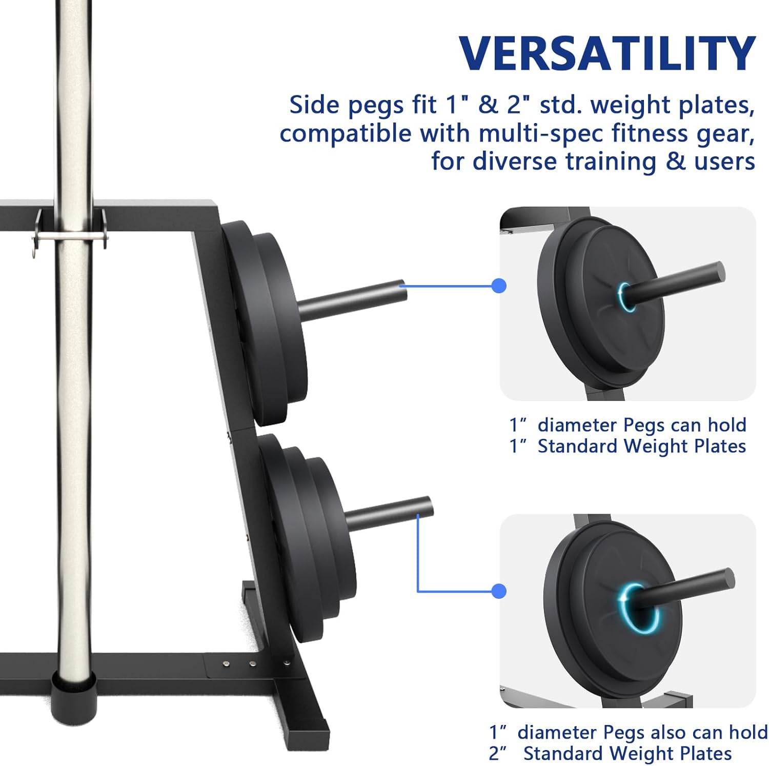 Side pegs fit 1″ & 2″ std. weight plates, compatible with multi-spec fitness gear, for diverse training & users