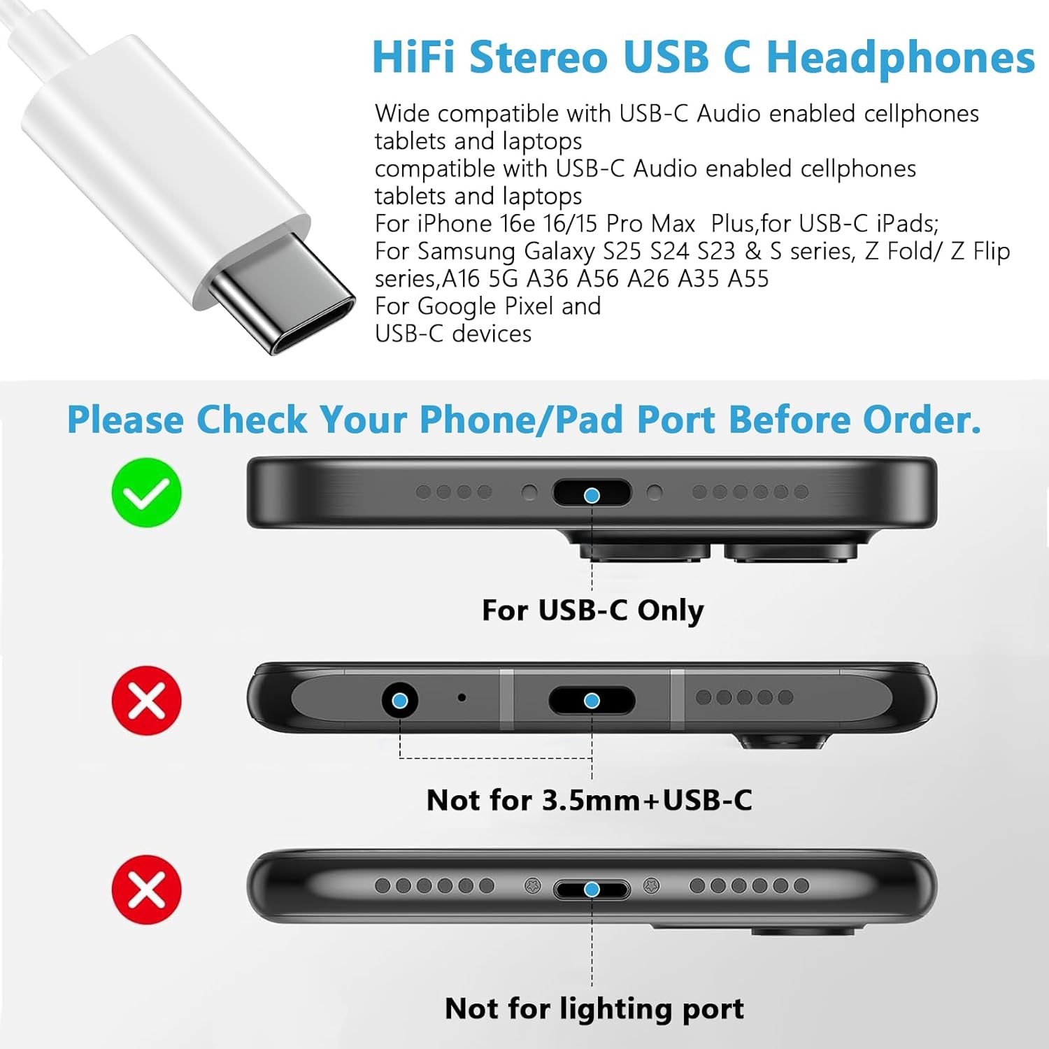 USB C Headphones Wide Compatibility: This usb c wired headphones is compatible with all USB C devices without 3.5mm jack audio port. iPhone 16e iPhone 16/16 Pro/16 Pro Max/16 Plus,iPhone 15/15 Pro/15 Pro Max/15 Plus; Samsung Galaxy A16 5G A16 A26 A36 A56 S25 Ultra S25+ S25 A35 A55 A24 A54 A34 S24 Ultra S24+ S24 FE S24,S23 Ultra S23+ S23 FE S23,S22 S22+ S22 Ultra,S21,S21 Plus,S21 FE,S21 Ultra,S20 Ultra S20 FE S20 Plus,Z Fold 6 5 4 3,Z Flip 6 5 4, Google Pixel, LG and more type c devices