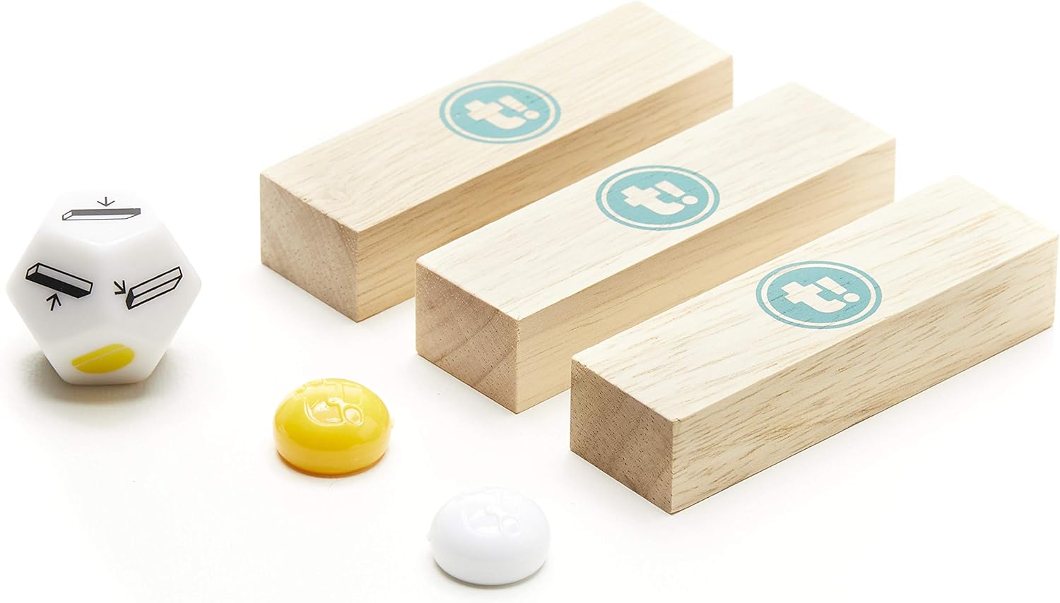 GAME SPECIFICS: For 2 or more players ages 8 years and up. Includes 54 High Grade Rubberwood Bricks, 2 Wood Base Pieces, 15 White Tumps, 10 Yellow Tumps, and 1 Twelve-Sided Die.