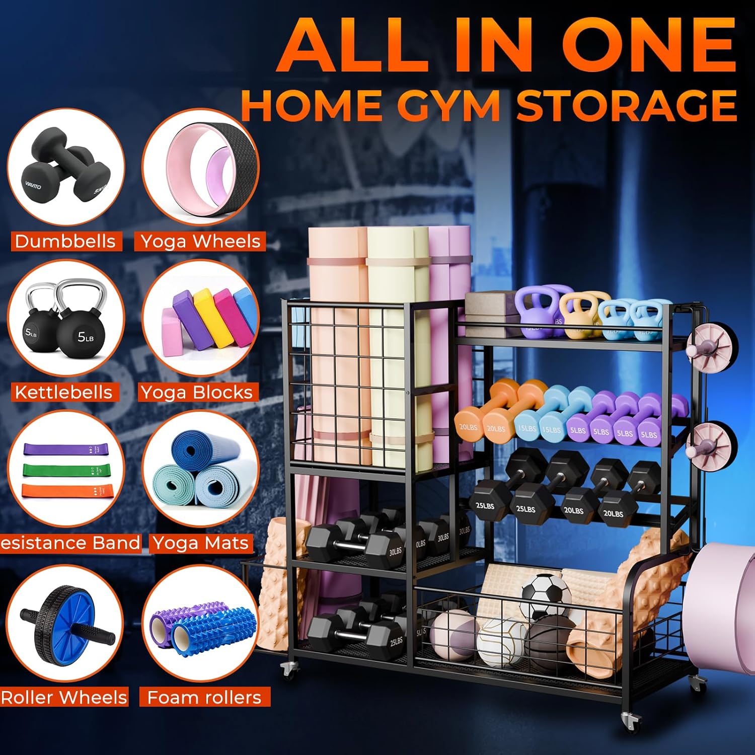 【All-IN-ONE HOME GYM STORAGE RACK】This weight rack allows for the storage of a wide range of home gym equipment, including the top metal layer for kettlebells, a 2-layer dumbbell rack for dumbbells, a side basket for yoga mats and foam rollers, the storage basket on the left can hold some baseball bats, tennis rackets or yoga mats,several side hooks for resistance bands, fitness bands and rollers, and a bottom storage basket for balls, yoga blocks and other exercise equipment.