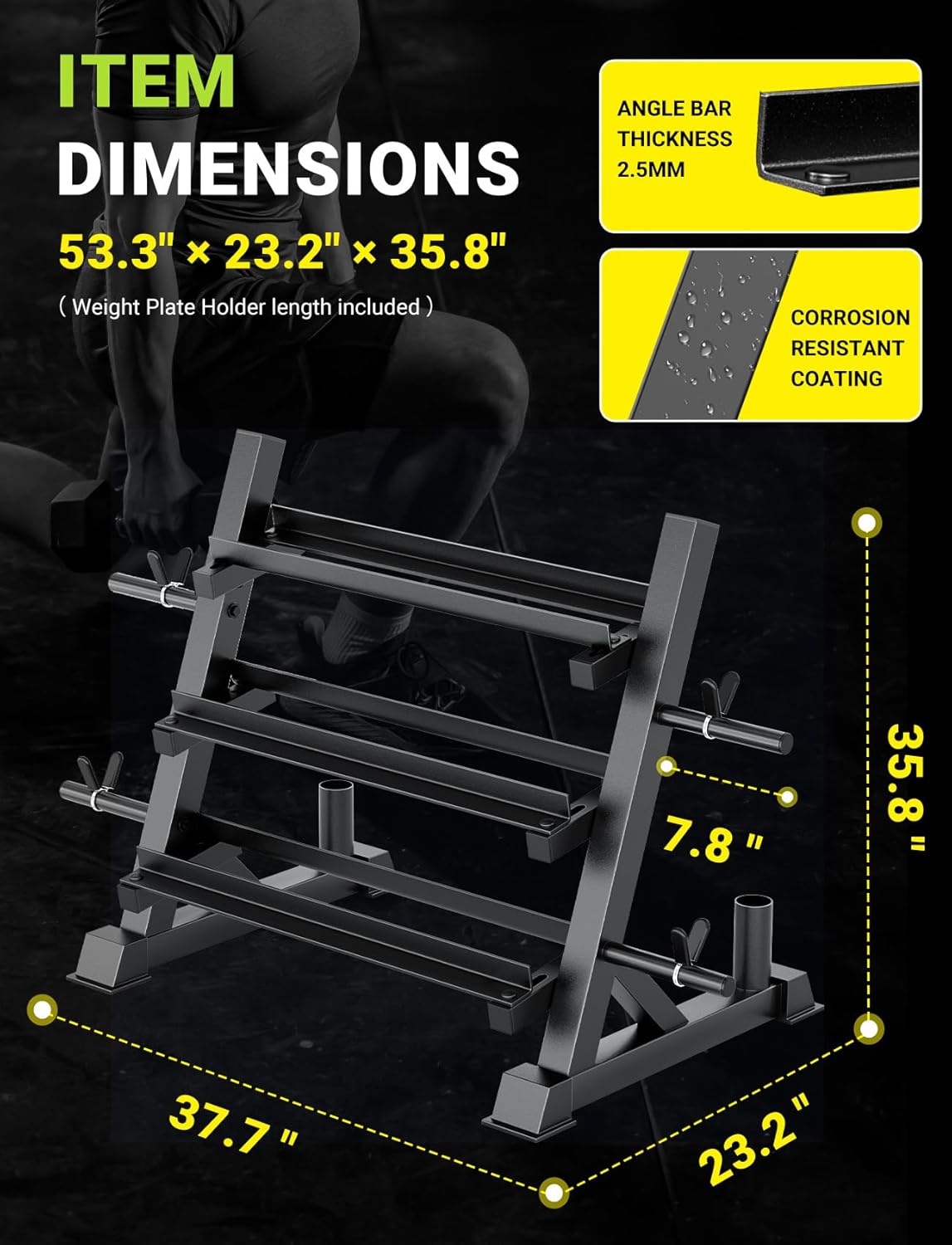 YOLEO Upgraded Dumbbell Rack – Maximize your home gym efficiency with this heavy-duty 3-tier powerhouse. Engineered with 2.5mm industrial-grade steel and anti-rust coating, it effortlessly supports up to 1100LBS of dumbbells, barbells (fits 1″ & 2″ bars), and weight plates. Customize storage with adjustable angle steel tiers (2.3″-5.3″ length compatibility) and reclaim space through its ultra-compact footprint (53.3″L x 23.2″W). Assemble tool-free in minutes and enjoy lifetime hassle-free support—snapped bolts replaced free within 24hrs. Built to outlast your fitness journey.
